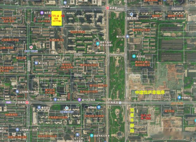 此次幸福林带挂出的XC11-4-96地块,位于新城区康乐路与韩森路西南角,东侧紧邻融创东方宸院,占地10.775 亩。
